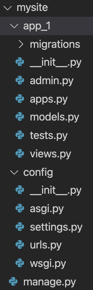 앞서 우리가 startproject config .로 폴더 내에 프로젝트 파일을 생성하고 나면 디렉토리 구성은 아래와 같았다
