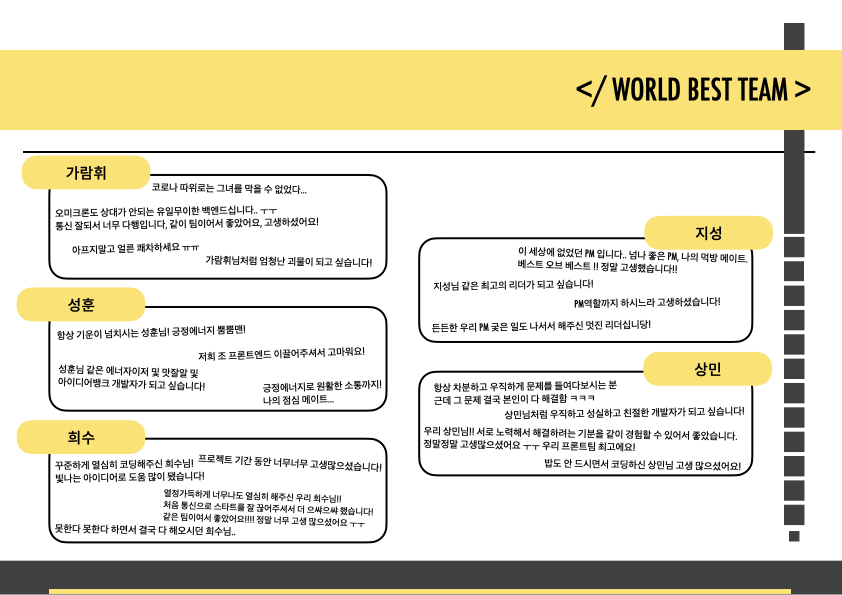 어느 하나 뾰족한 사람 없이 둥글둥글한 모습들로 힘들 텐데도 프로젝트에 임해주신 여러분들께 정말 감사드리고 싶습니다!