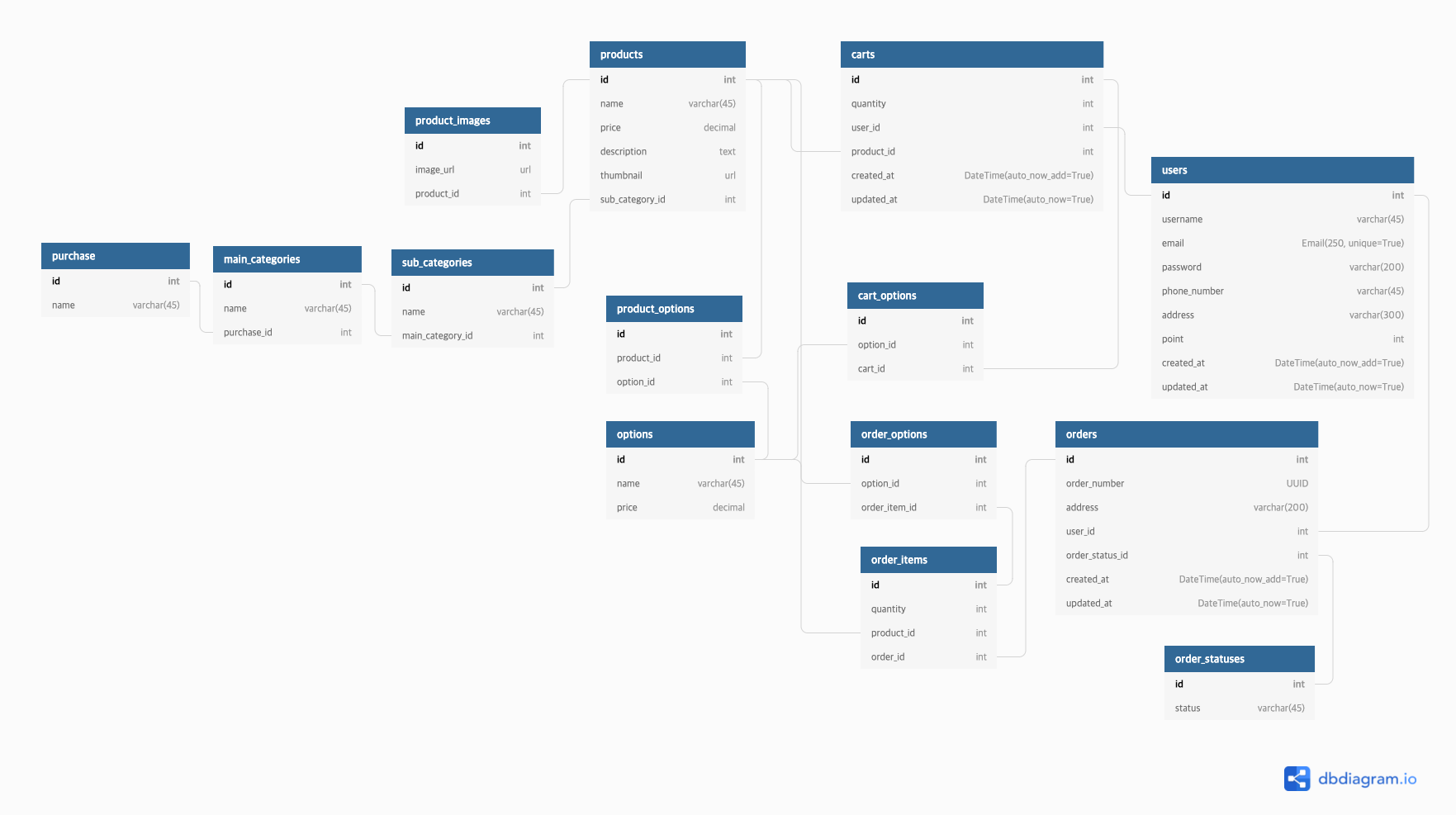 products, carts, order_items에 각각 options와 이어진 중간 테이블을 넣었다
